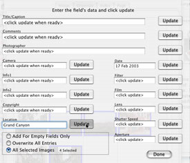 ExampleIf you have 20 images of the Grand Canyon, 3 of Las Vegas and 5 of Lake Powell you can do this.... Select the 3 of Vegas and hit the "Propagate" button. Put in Las Vegas in the Location field and click "Update". Then hit "Done." Then select the Lake Powell images and hit the "Propagate" button. Put in Lake Powell and click "Update." Then switch modes by clicking on the "Add For Empty Fields Only" radio button. Put in Grand Canyon into the Location field and click "Update".How ToFirst select your images. You can shift click each one. Or you can drag a region (a square) to select them. Once selected, they will turn blue. You can shift click to unselect them also. To select a large group at once, click in the border near a picture and drag the square.Once selected, click the Propagate Button. The pane will drop down with the "Selected" option already chosen. Type in the value you want (such as "Grand Canyon" under location), then click the Update Button. |