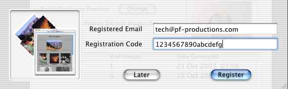 You will be sent a registration code which will convert the program from demo into registered. You must give them a valid email address. To register, you select "regester" under the "Image2Web" menu. You put in the email you registered the program with and the code.